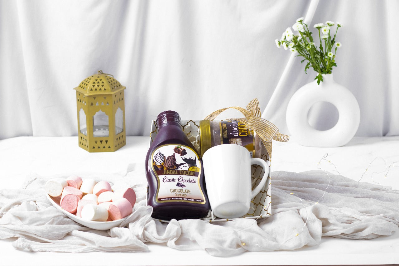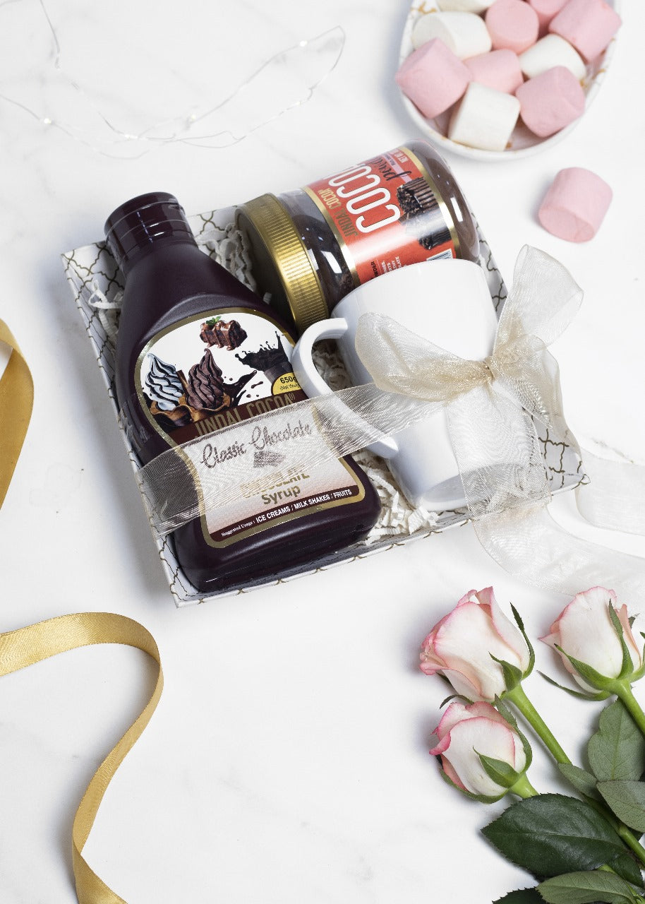 - A Perfect Chocolaty Gift for All Occasions That Offers High Value. Complete With Drinking Chocolate Powder (Mocha, Cinnamon, Or Pure Cocoa) Syrup, Mug, And Marsh Mallows.